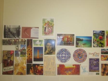 A few notes about my wall: I don't put everything up all at once, in fact if I wanted to put up all my postcards the wall would be full; I change things about all the time, taking things down, putting things up; usually the reason I take something down is because I have decided to send it to someone; some of these things I have had for years, one I got just today; there are awkward gaps that I am trying to fill; I know one day this will reach all the way to the ceiling but I am concerned about reaching that point and then having nowhere to stick new things.... then again, perhaps I can start on a new space.